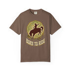A rearing bronco, swirling dust, and that "Born to Ride" energy that hits different when you actually live it. This garment-dyed tee on a Comfort Colors 1717 blank has that broken-in softness from the first wear. Heavyweight ring-spun cotton that feels like you've owned it for years. Relaxed fit, no side seams, and colors that look sun-faded in the best way.